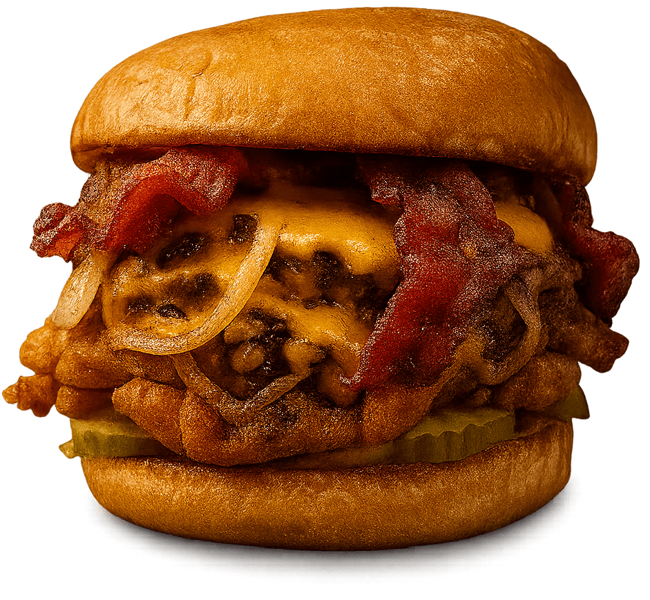 Triple the Wagyu, triple the flavor! Three smashed patties, three slices of American cheese, caramelized onions, crispy bacon, waffle fries, and our secret sauce piled high on a soft potato bun.